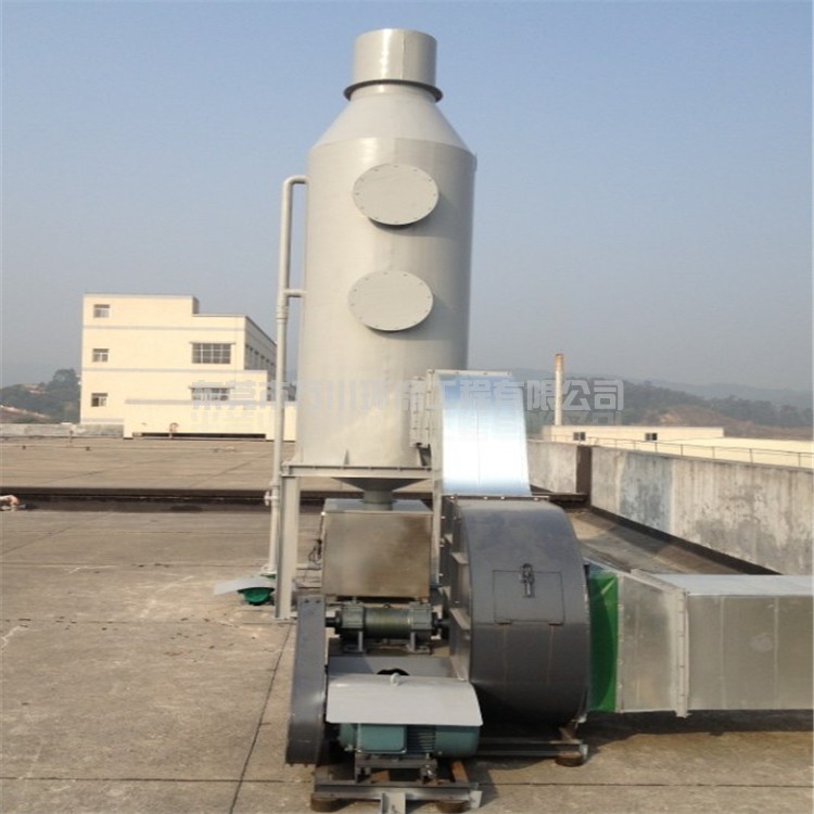含塵廢氣在風(fēng)機的作用下,含塵氣體從塔體下方進氣口沿切向進入濕式除塵器噴淋塔,在風(fēng)機的作用下,迅速充滿進氣段空間,然后塔頂位置的噴淋頭向下噴水,水與含塵廢氣接觸,使得空氣和粉塵分離,達到除塵的效果。濕式除塵器噴淋塔具有結(jié)構(gòu)簡單、造價低、占地面積小、凈化效率高等優(yōu)點,能夠處理高溫、高濕的氣流,將著火、爆炸的可能減至最低。