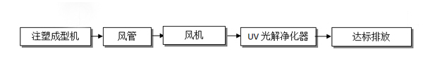 該公司在生產(chǎn)過程中有注塑成型工序,該工序產(chǎn)生了一定量非甲烷總烴有機(jī)廢氣。根據(jù)廠房提供的資料,我們工程師在參考了廣東省地方標(biāo)準(zhǔn)《大氣污染物排放標(biāo)準(zhǔn)》(DB44/27-2001),中華人民共和國《大氣污染物綜合排放標(biāo)準(zhǔn)》(GB16297-1996)后,根據(jù)以往工程經(jīng)驗(yàn),為該企業(yè)選擇了UV光解為主體處理工藝。