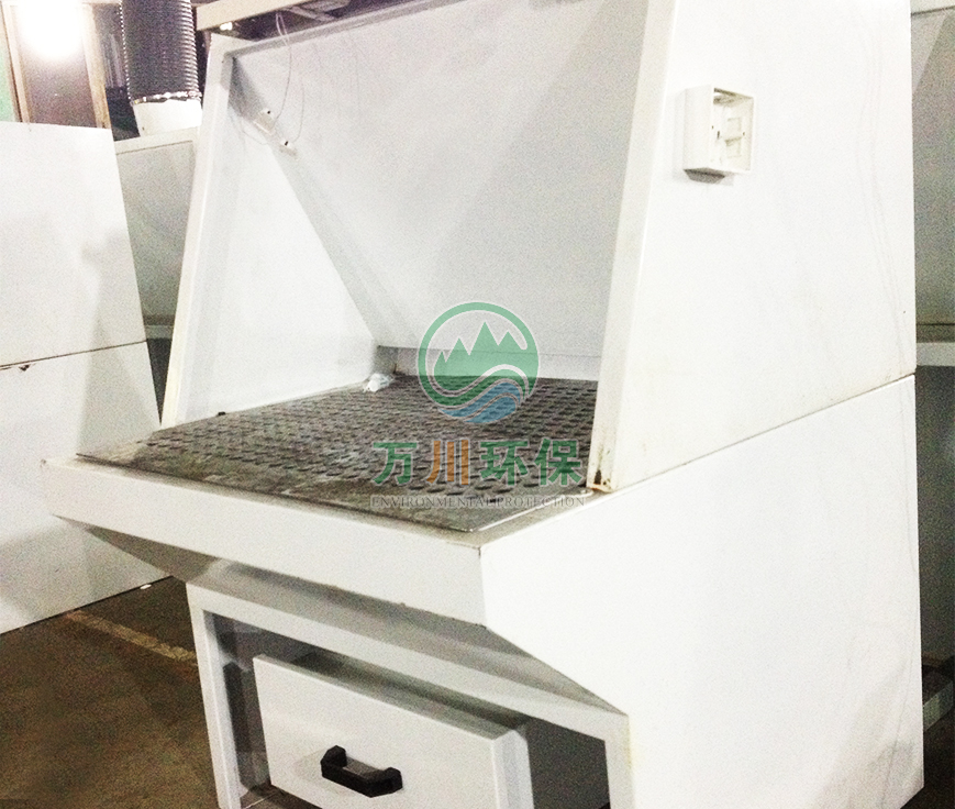 粉塵通過風(fēng)機產(chǎn)生的負壓經(jīng)打磨臺正面下側(cè)吸風(fēng)口進入打磨臺,大顆粒粉塵與內(nèi)板碰撞后,受重力的作用下落入集灰抽屜,細小顆粒的粉塵沿風(fēng)口上升到集塵管道,最后進入粉塵處理設(shè)備,經(jīng)有效處理后高空排放。
